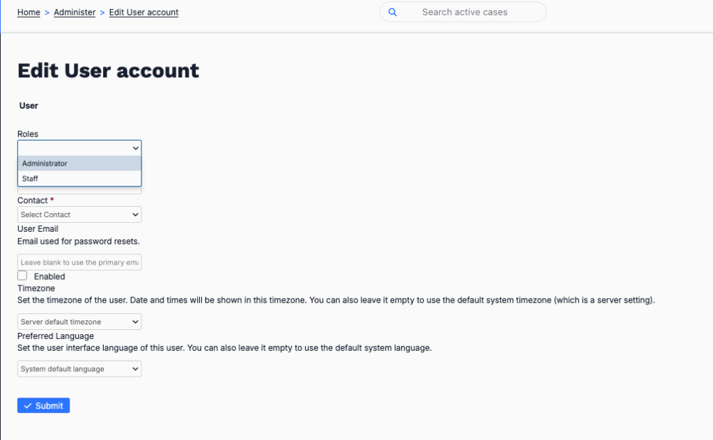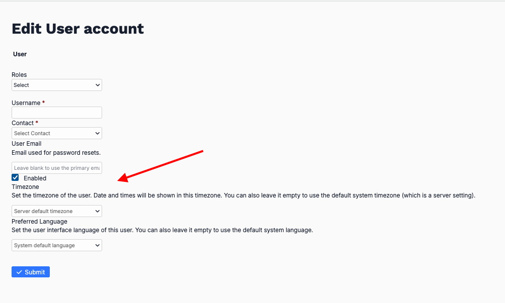 A new dialogue will open where you can enter all the details for the new user. Don’t forget to tick the Enable user checkbox as well.