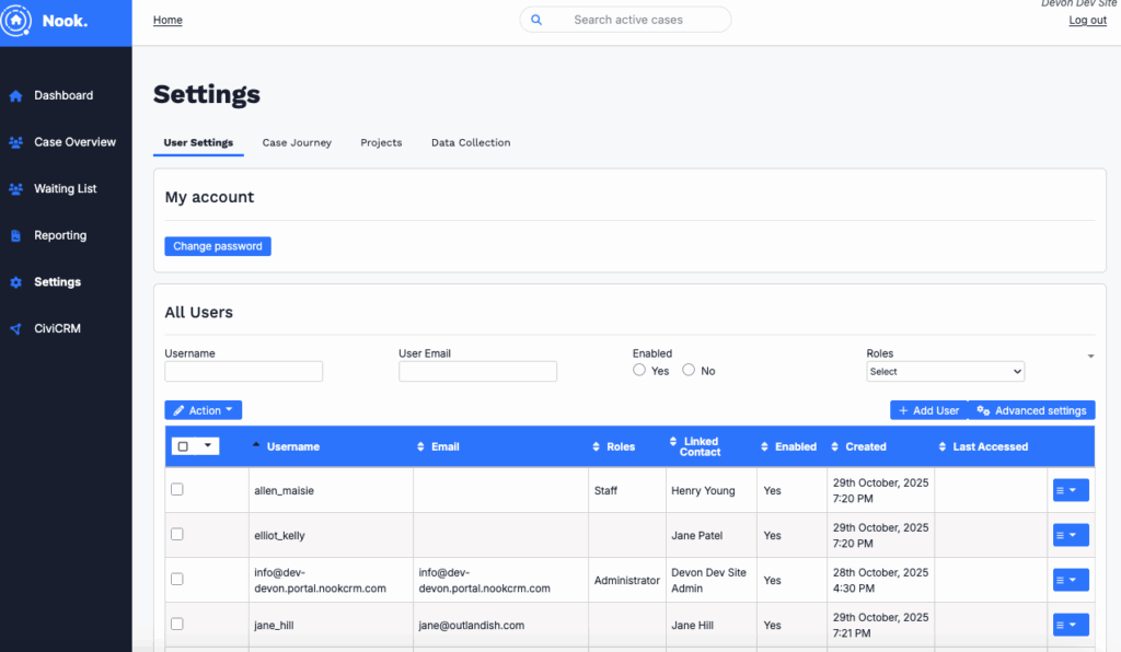 The main difference is that Staff users aren’t able to view or manage any settings, including user management, client journey and project configuration. They will also not have an option to delete reporting templates.