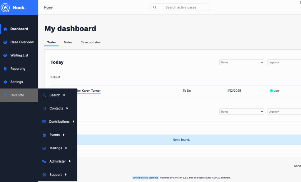 Admins, on the other hand, can see the Settings section in Nook and have access to the core CiviCRM menus via the navigation bar (aimed at power users).